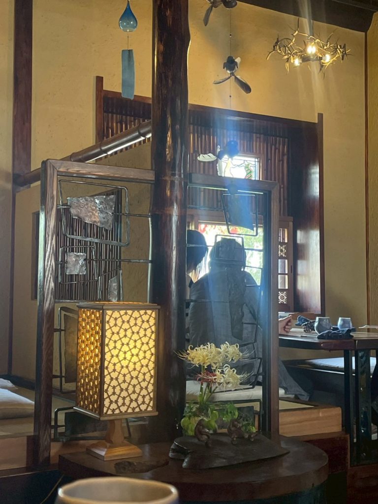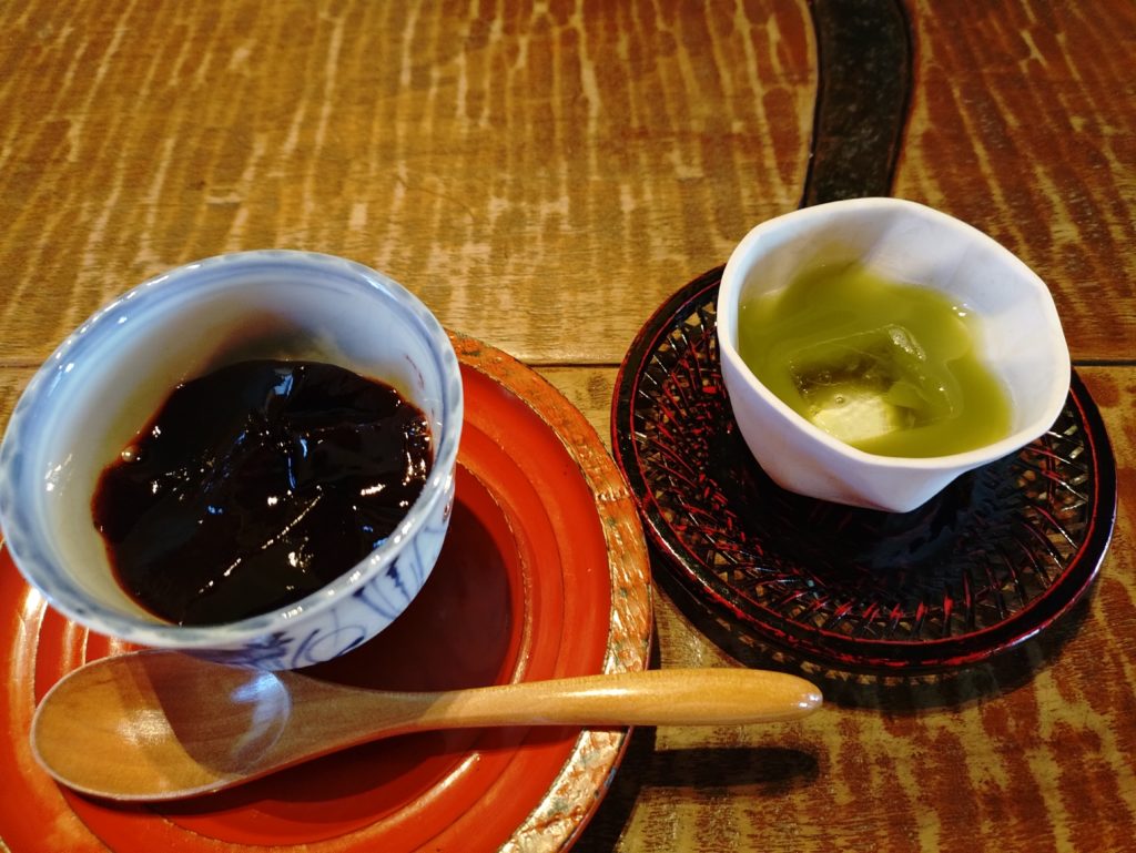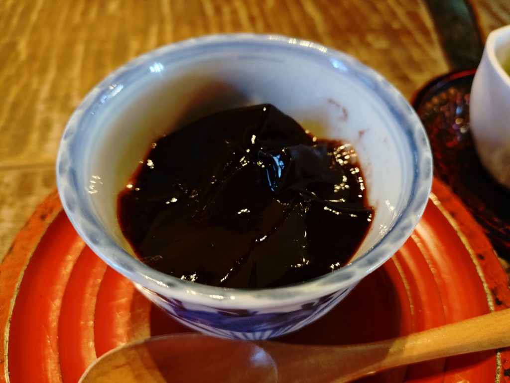 冷やしあずきと緑茶でした。冷やしあずきとは羊羹がぎりぎり固まるくらいに留めたものらしく、この状態のものを振ってしまうと液体に戻ってしまうとのことでした。 初めて食べたのですが、甘みも程よく美味しかったですね。